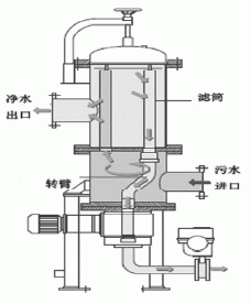 轉臂式自清洗過濾器是一種集約化的過濾器,多個濾筒安裝于一個過濾器筒體內,結構緊湊。轉臂式自清洗過濾器用于去除低粘度介質中的固體顆粒。需過濾的介質從內向外流過過濾器的楔形網濾筒,固體顆粒截留在濾筒內側。隨著污染物的增多,過濾器污染側和清潔側之間的壓差增大。若壓差達到設置的觸發壓差便開始自動反沖洗。反沖洗時.齒輪電動機轉動欲清洗濾筒下面的沖洗臂,進入反沖洗狀態的濾筒的原料液流被中斷。反沖洗閥開啟,濾液側和反沖洗管路之間的壓降把一小部分濾液逆向沖入欲清洗的濾筒。聚積在濾筒內側的污染顆粒物被松開并通過沖洗臂沖進反沖洗管路。每個濾筒的反沖洗時間一過,反沖洗閥立即關閉。這樣所有濾筒被依次清洗。所有濾筒都被清洗后,反沖洗循環結束。轉臂式自清洗過濾器可以用來除去工業用水和海水中的固體雜質。轉臂式自清洗過濾器常用于保護重要設備,如冷卻系統、化學和水處理裝置等。圖3為轉臂式自清洗過濾器結構示意圖。